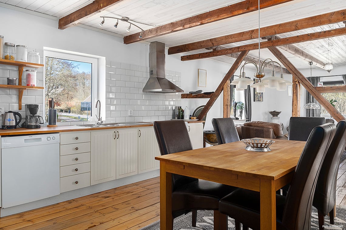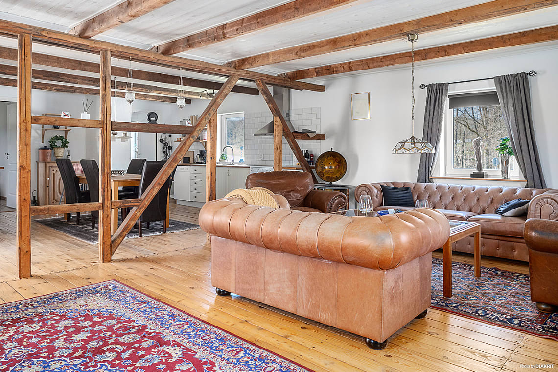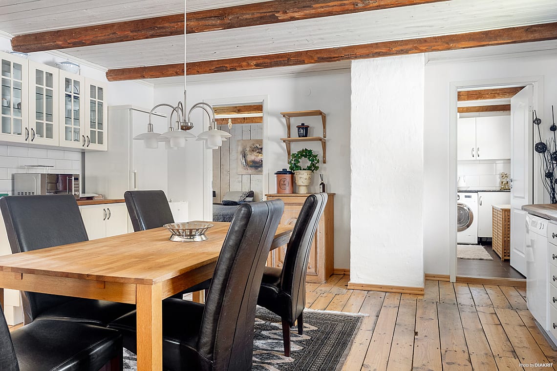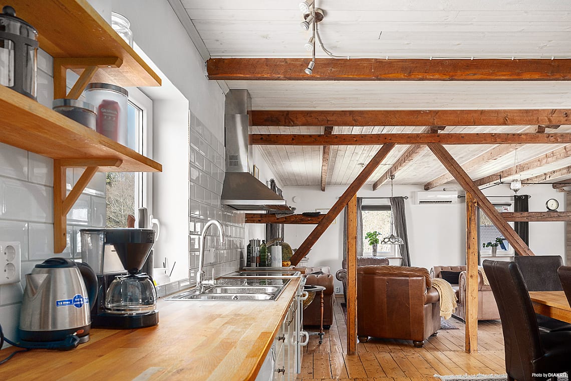 Stort och ljust kök/allrum med öppen och inbjudande planlösning, där synliga takbjälkar och detaljer med karaktär sätter stilen. En charmig och social yta som bjuder in till både vardagsliv och umgänge.