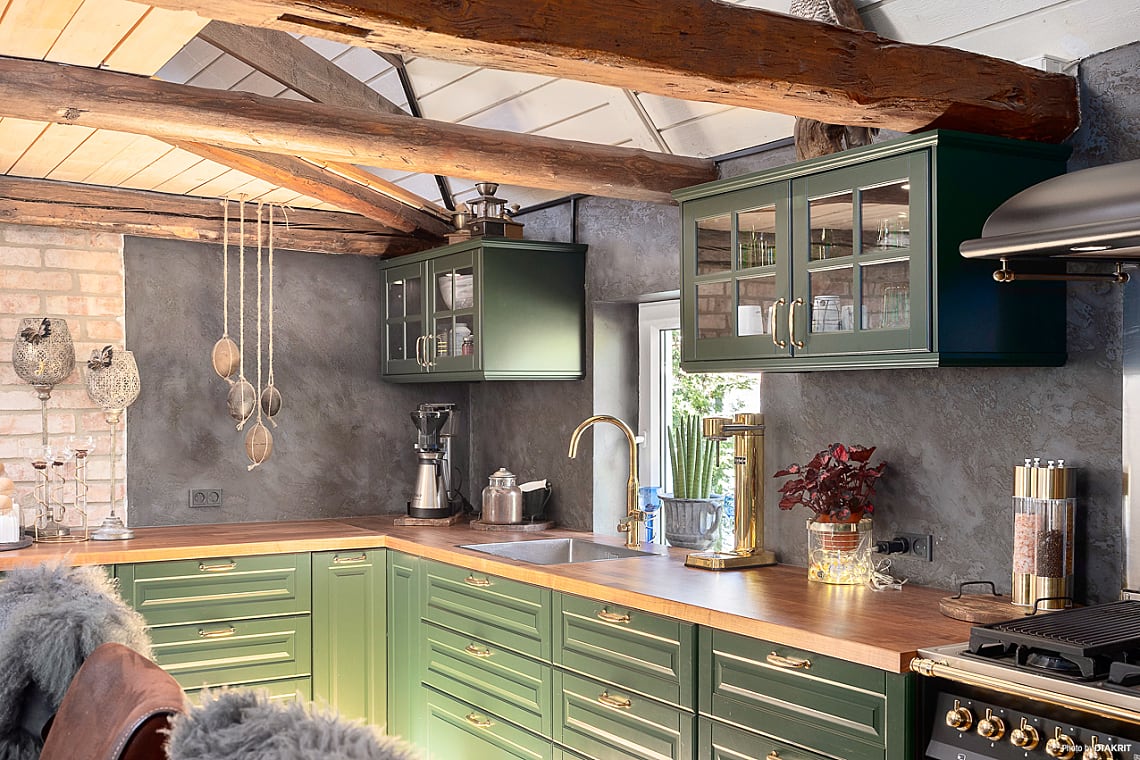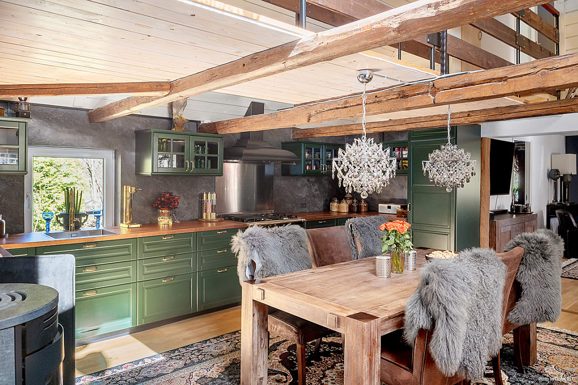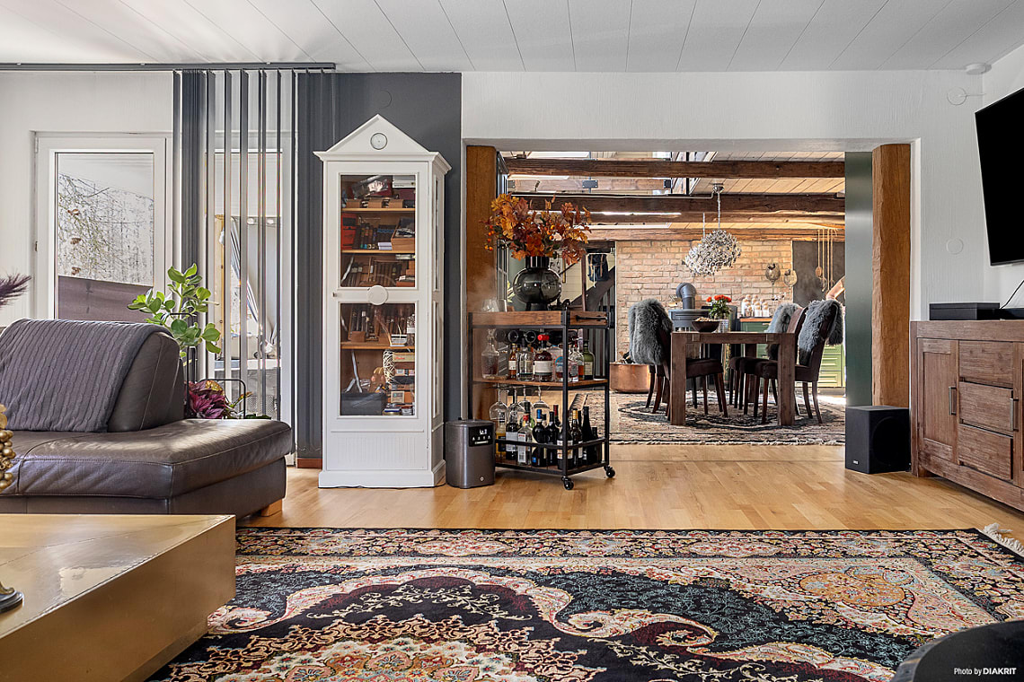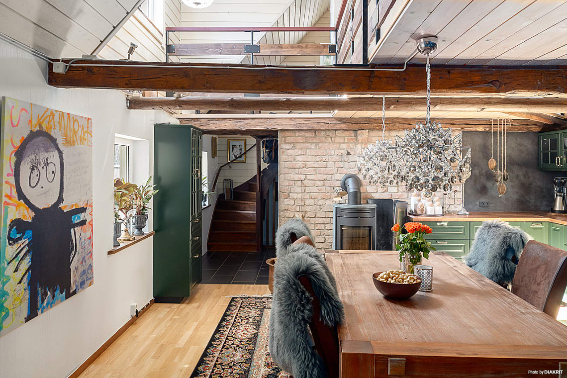 Stort och ljust kök/allrum med öppen och inbjudande planlösning, där synliga takbjälkar och detaljer med karaktär sätter stilen. En charmig och social yta som bjuder in till både vardagsliv och umgänge.