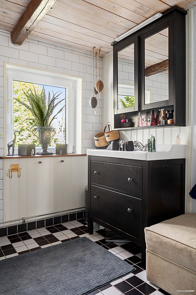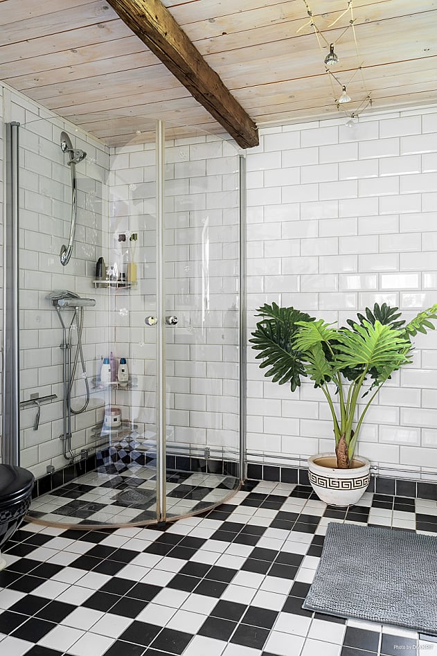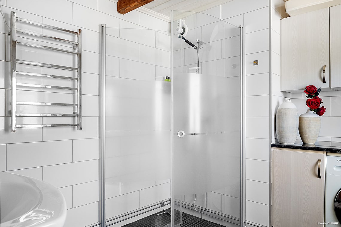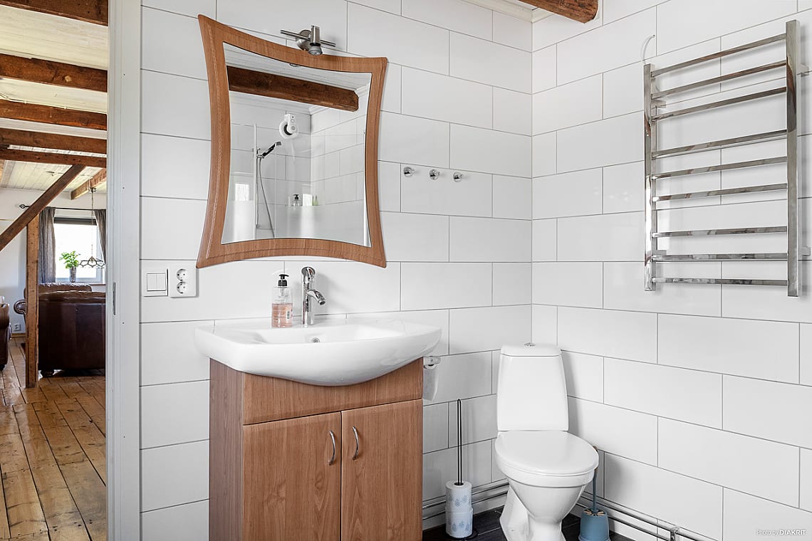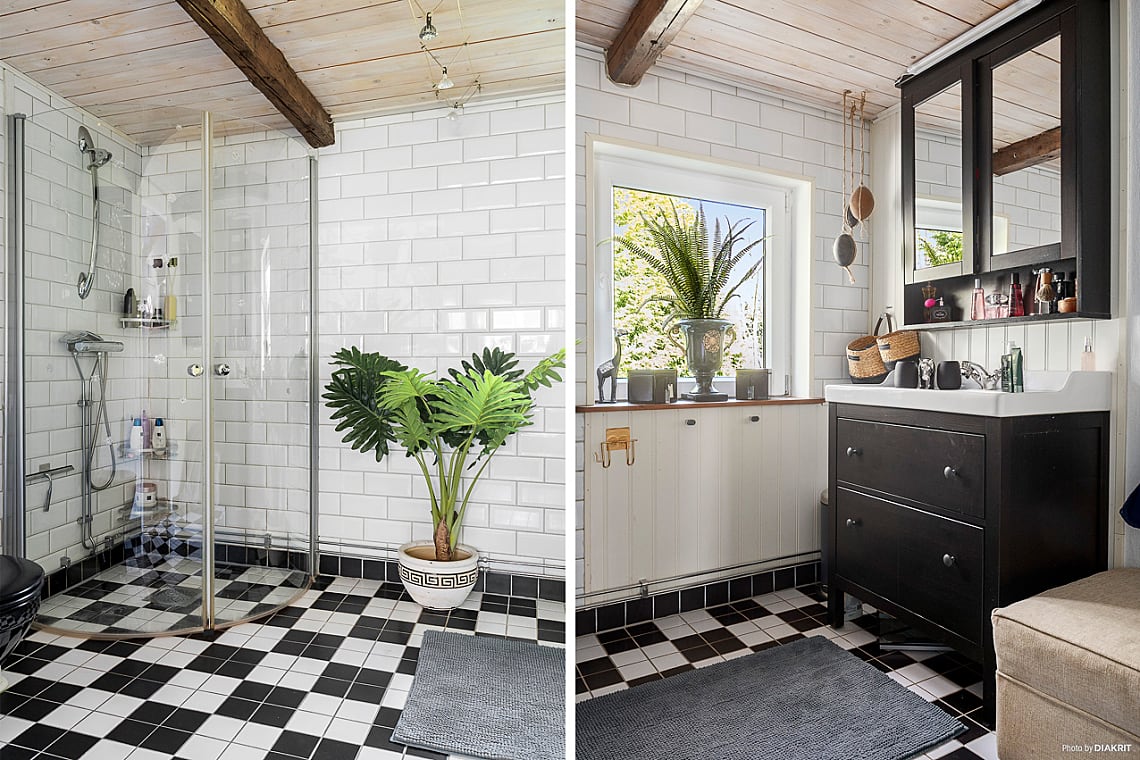 Stilfullt badrum med vita kaklade väggar och klassiskt rutigt klinkergolv. Takbjälkar adderar karaktär och charm. Badrummet är utrustat med dusch, WC, handfat i kommod, spegelskåp samt praktiskt vädringsfönster.