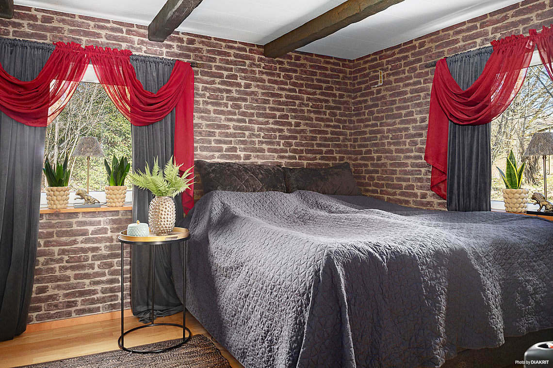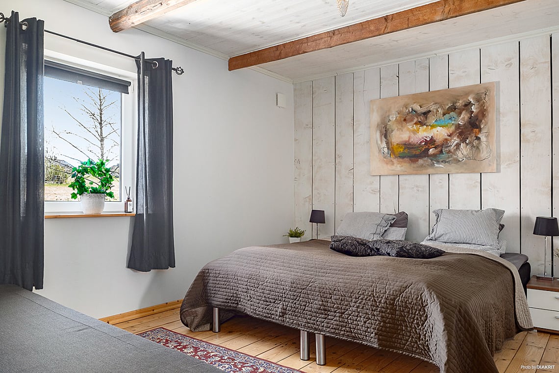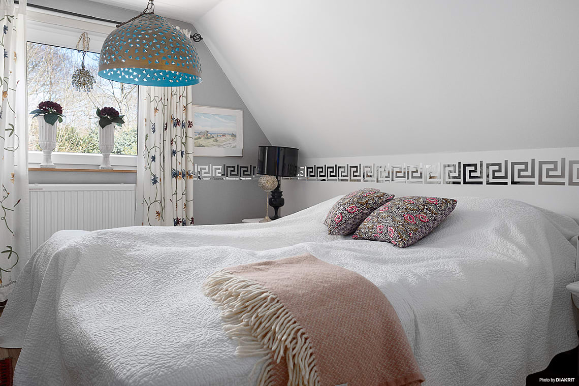 Trivsamt sovrum med plats för dubbelsäng och tillhörande möbler. Snedtaket bidrar med charm och en ombonad känsla.