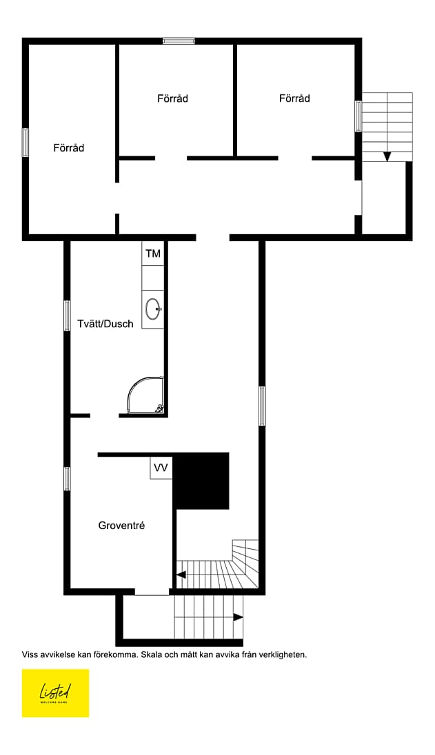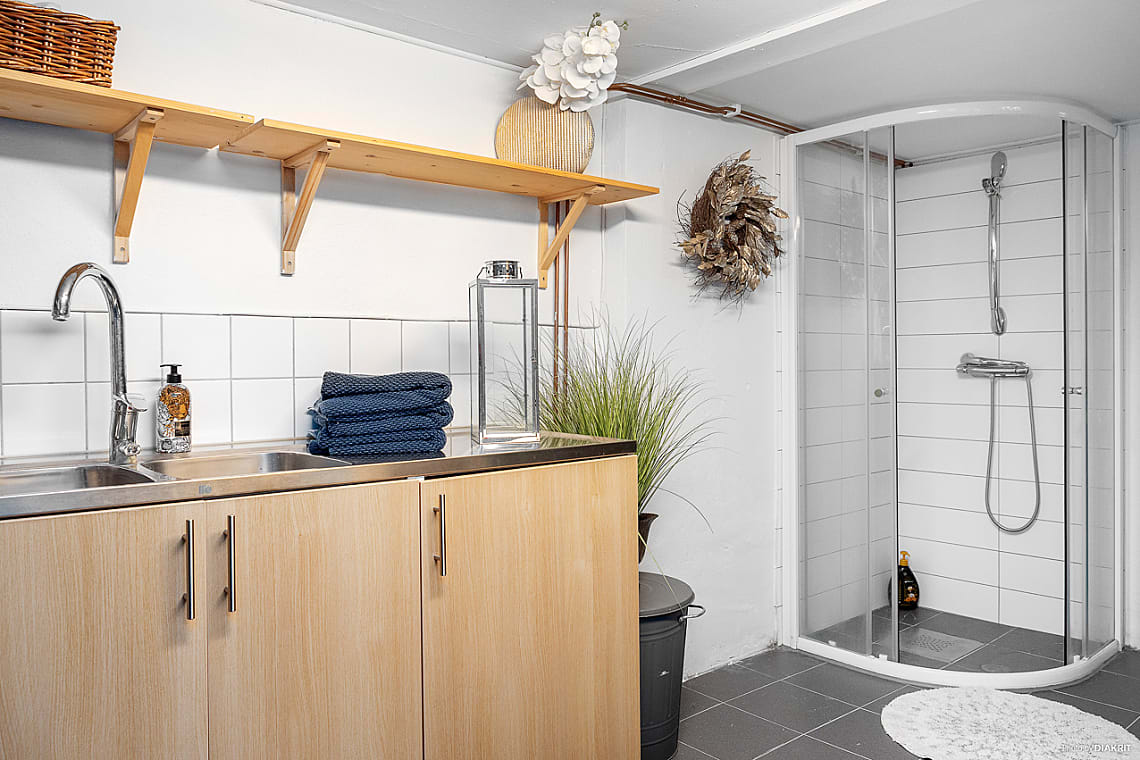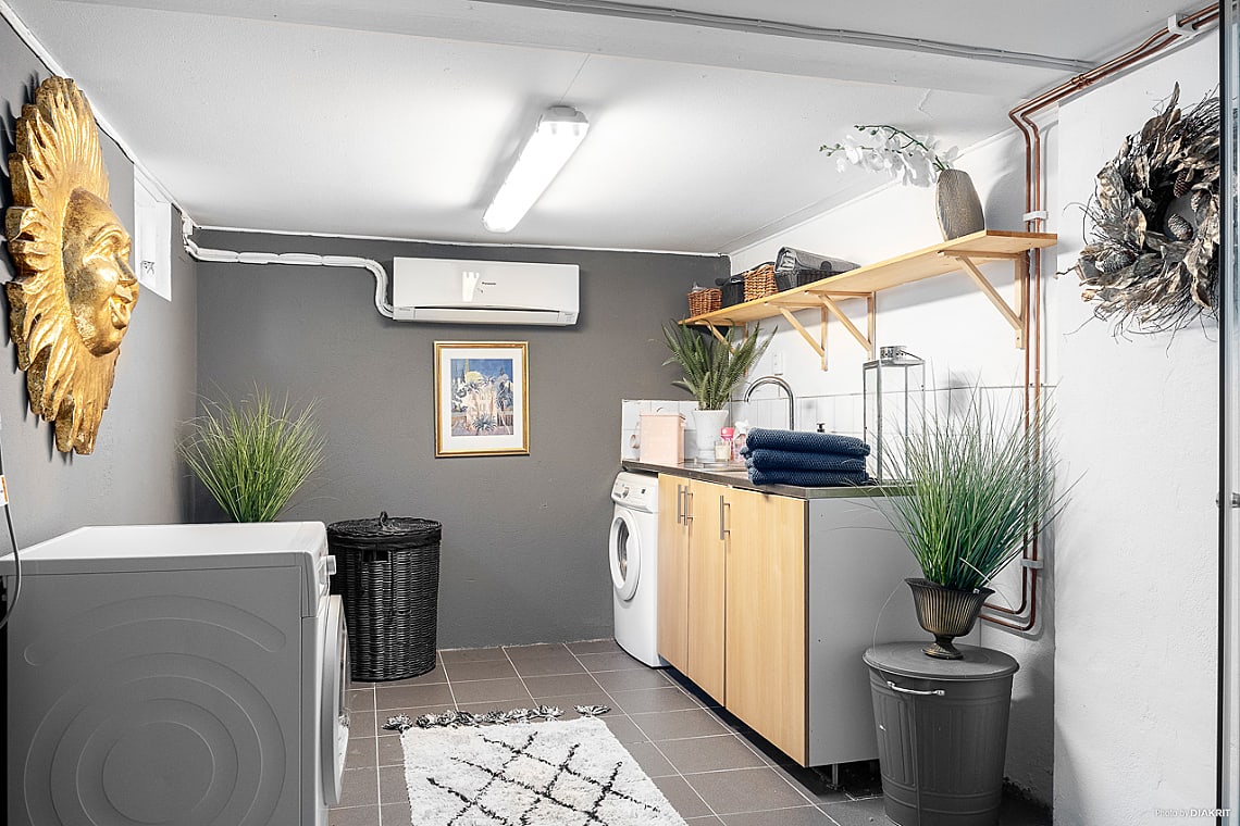 Källarplan inrymmer en groventré, förrådsutrymmen och tvättstuga med tvättmaskin och torktumlare, dusch och arbetsbänk med tvättho.