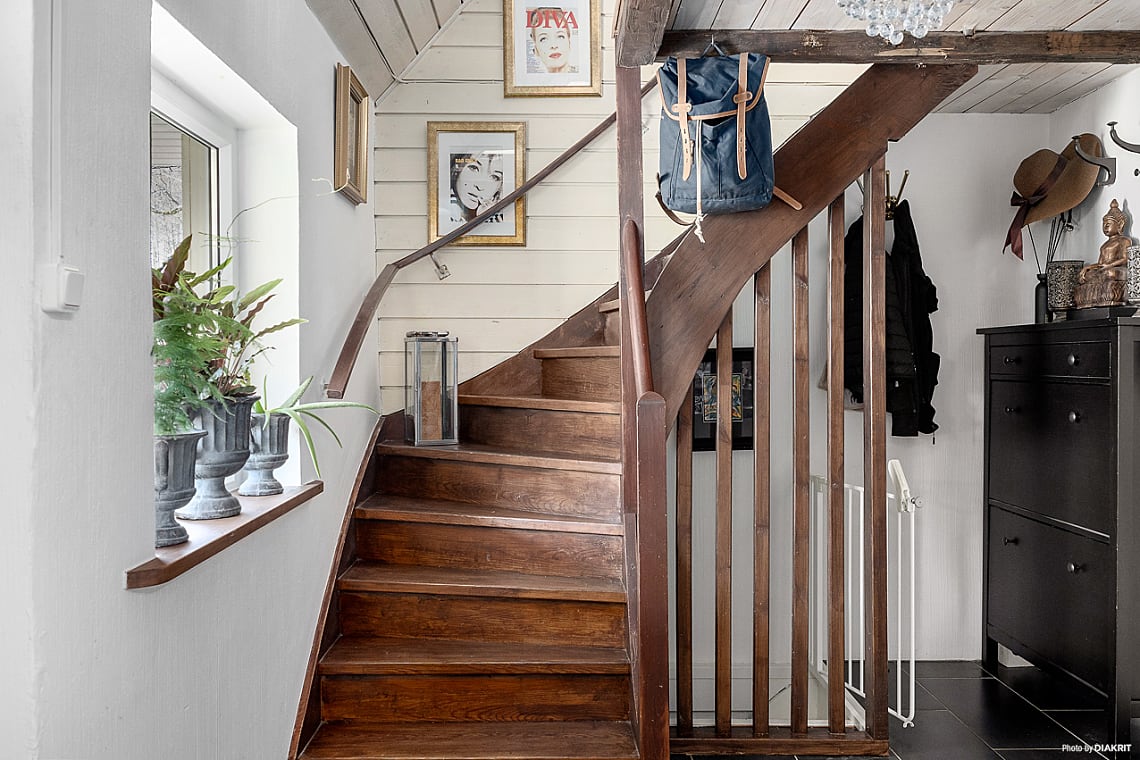 Välkomnande hall med plats för ytterkläder och skor. Här leder en stilfull trappa upp till övre plan samt en trappa ner till källarplan.