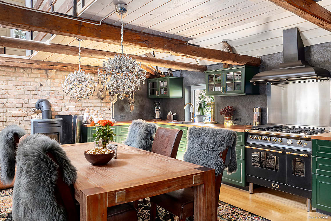 Stort och karaktärsfullt kök med tegelvägg, synliga takbjälkar och braskamin som skapar en varm och rustik känsla. Gasspis och ugn från Lofra, fläkt, diskmaskin och kylskåp ger köket full funktionalitet. Parkettgolv och generös rymd gör detta till ett kök att trivas i.