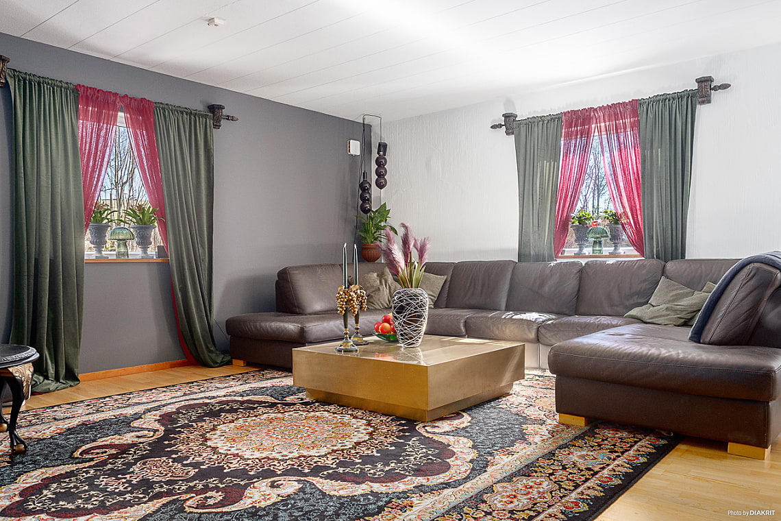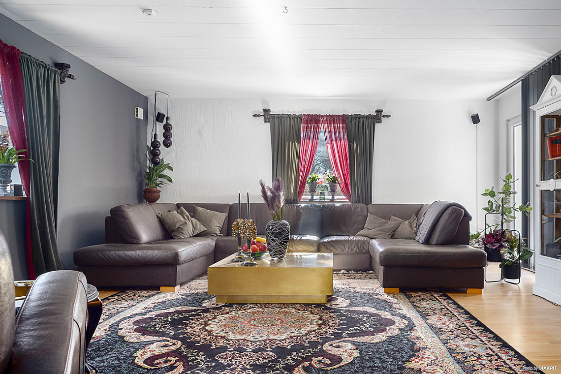 Rymligt och ljust vardagsrum med flera fönsterpartier som släpper in rikligt med dagsljus. Öppen och social planlösning mot köket skapar en naturlig samlingspunkt med generöst utrymme för både vardag och umgänge.