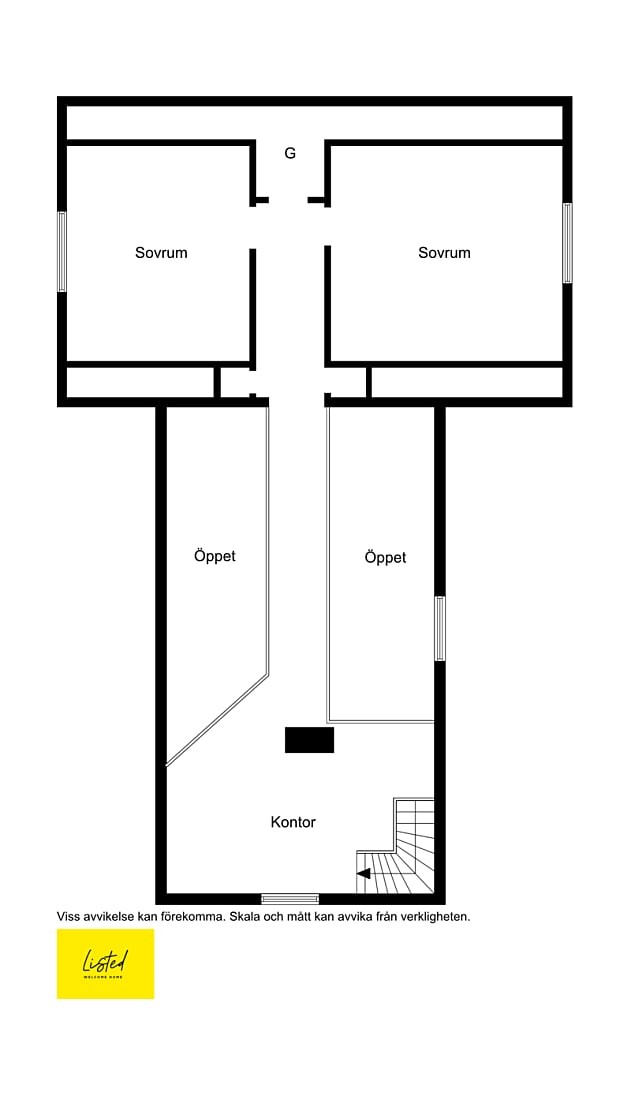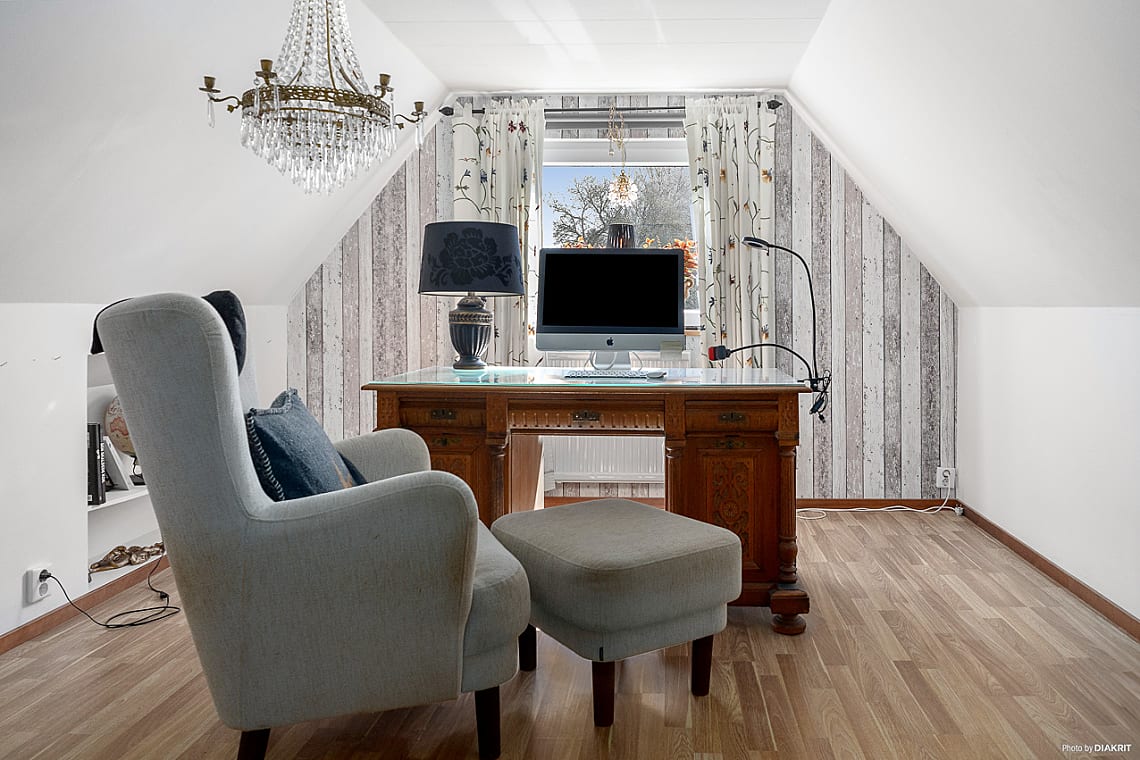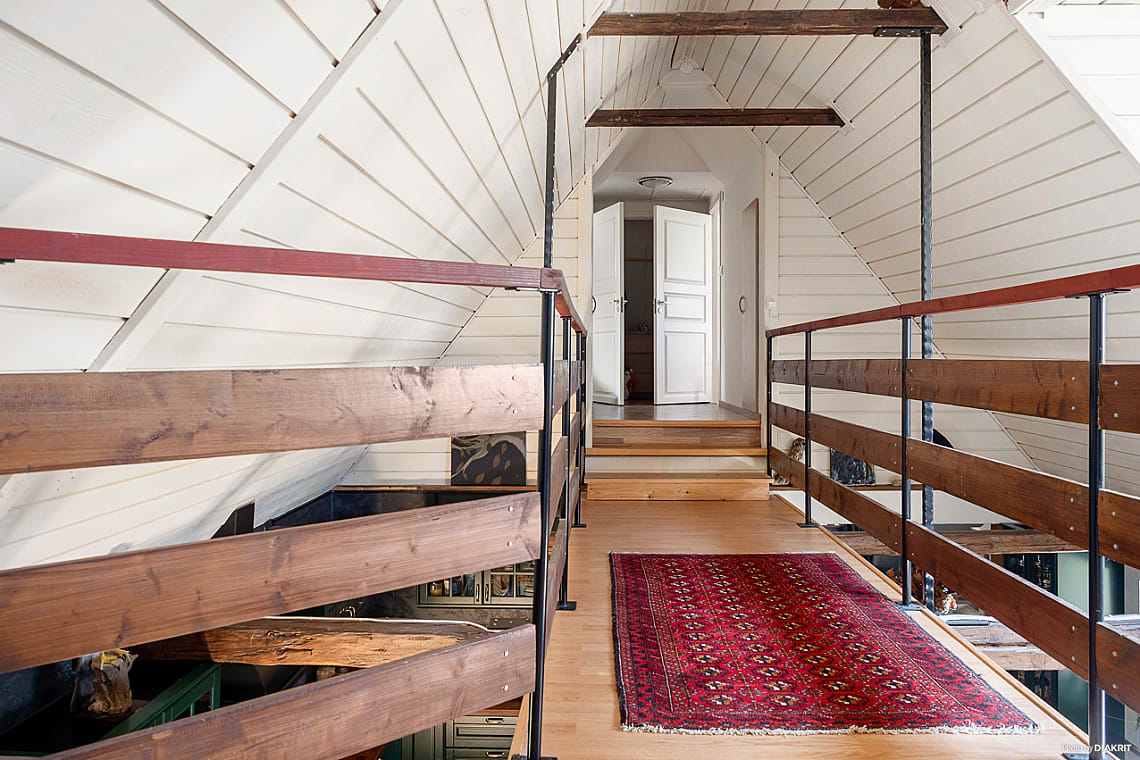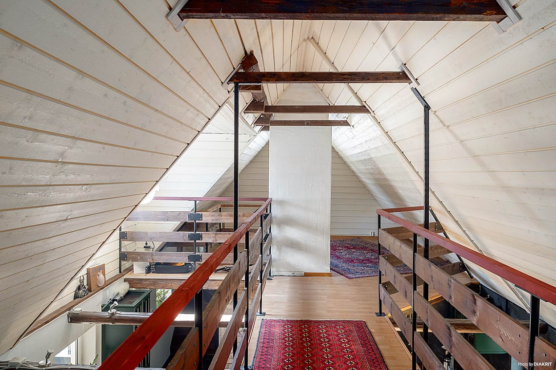 Öppet loft med flexibel planlösning. En del lämpar sig utmärkt som kontorshörna eller kreativ arbetsplats med vy ner mot rummet nedanför.