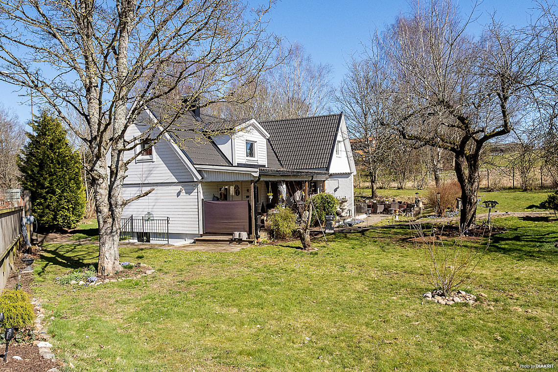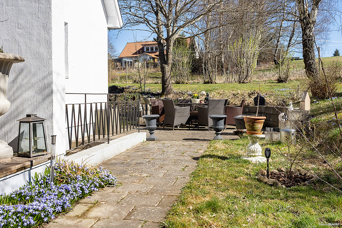 Den vackert anlagda tädgården utgör en grönskande oas med flera härliga uteplatser och fruktträd och bärbuskar. Perfekt för den odlingsinstresserade.