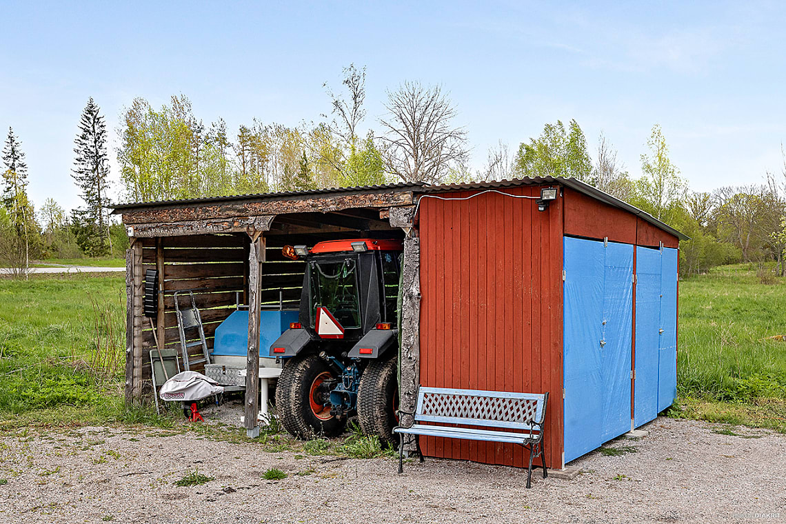 Enklare byggnad med mindre carport samt förråd för pelletsförvaring.
