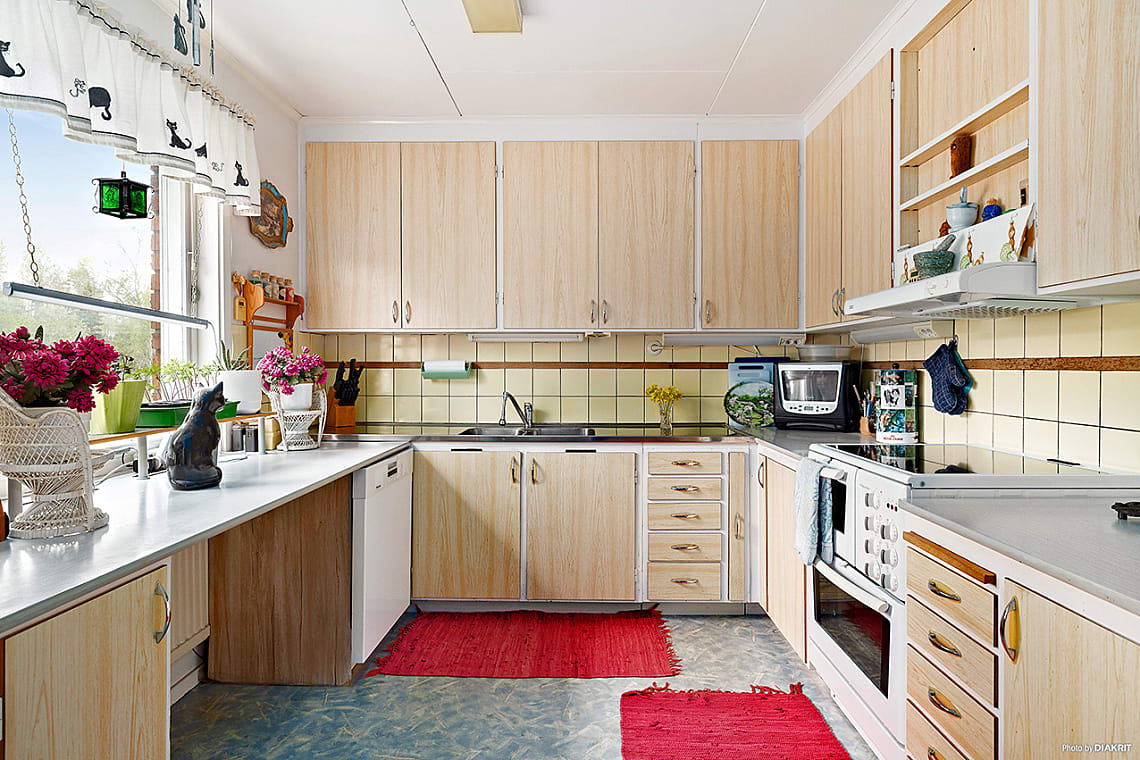 Trivsamt kök som är utrustat med spis med ugn, fläkt, diskmaskin samt kylskåp och frys i fullhöjd.