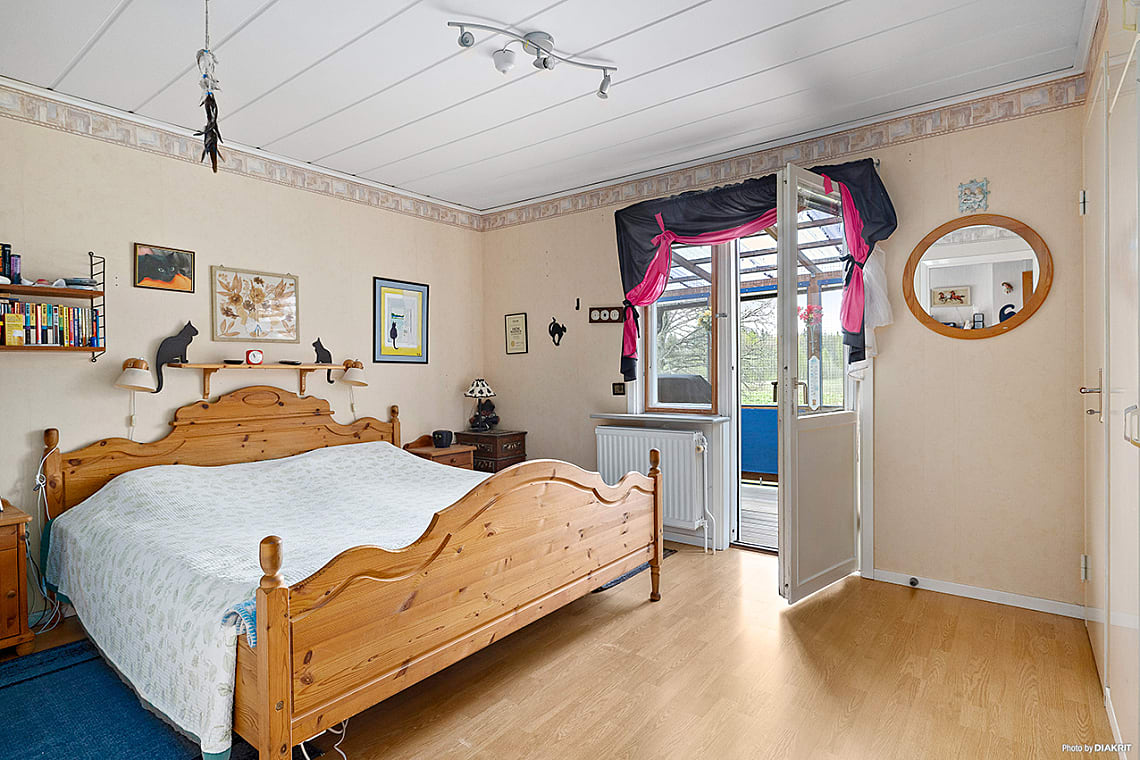 Stort sovrum med plats för dubbelsäng med tillhörande möblemang.
