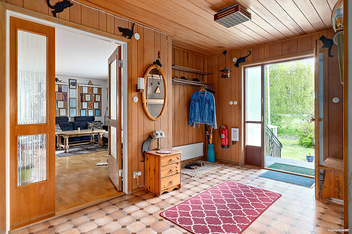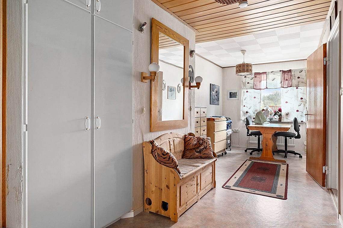 Rymlig och välkomnande hall med klädhängare samt plats för möblemang. Längre in i hallen finner man linneskåp samt en tv-hörna/kontorsplats.