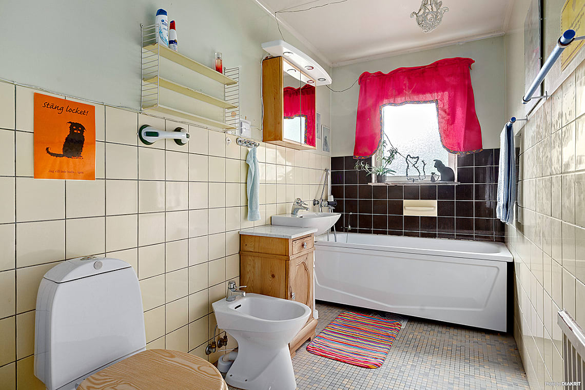 Wc, handfat, spegelskåp, badkar samt bidé.