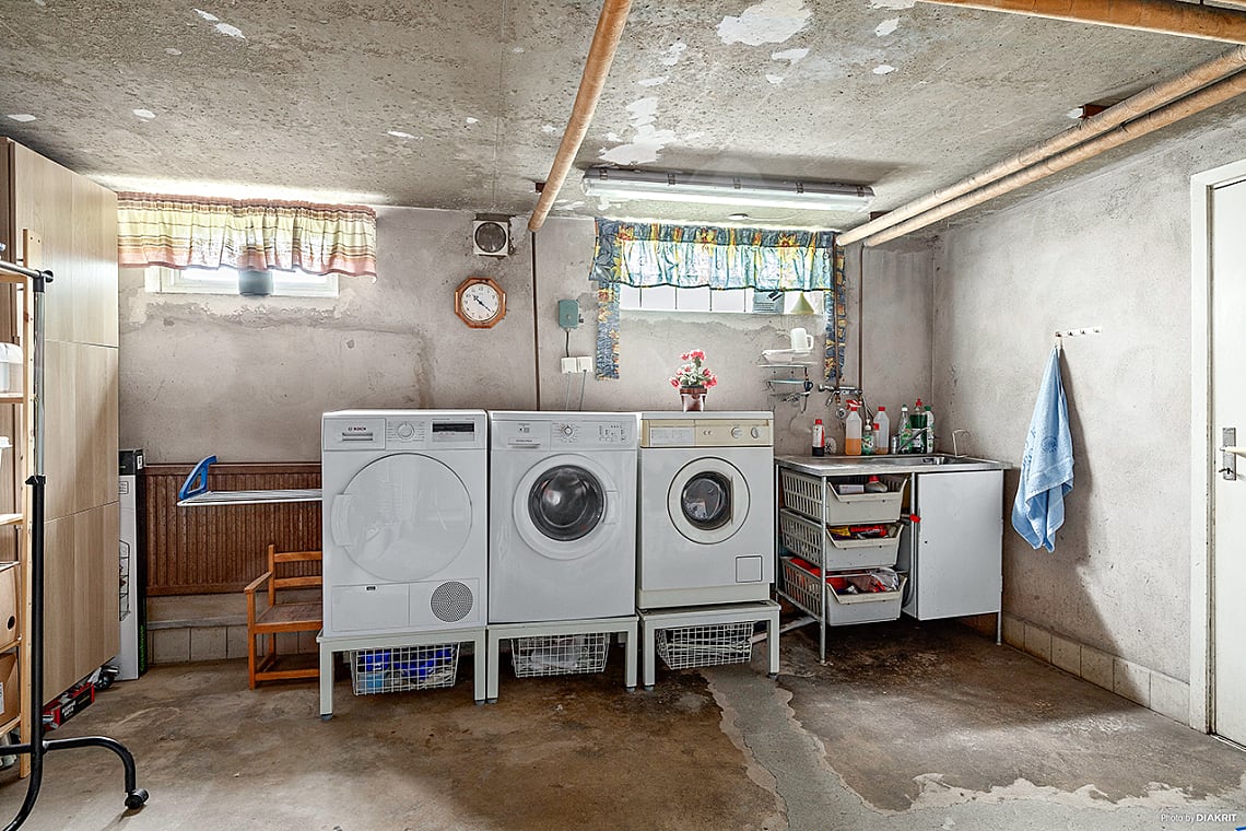 Här finns två tvättmaskiner varav ena i dåligt skick. En torktumlare samt vask.