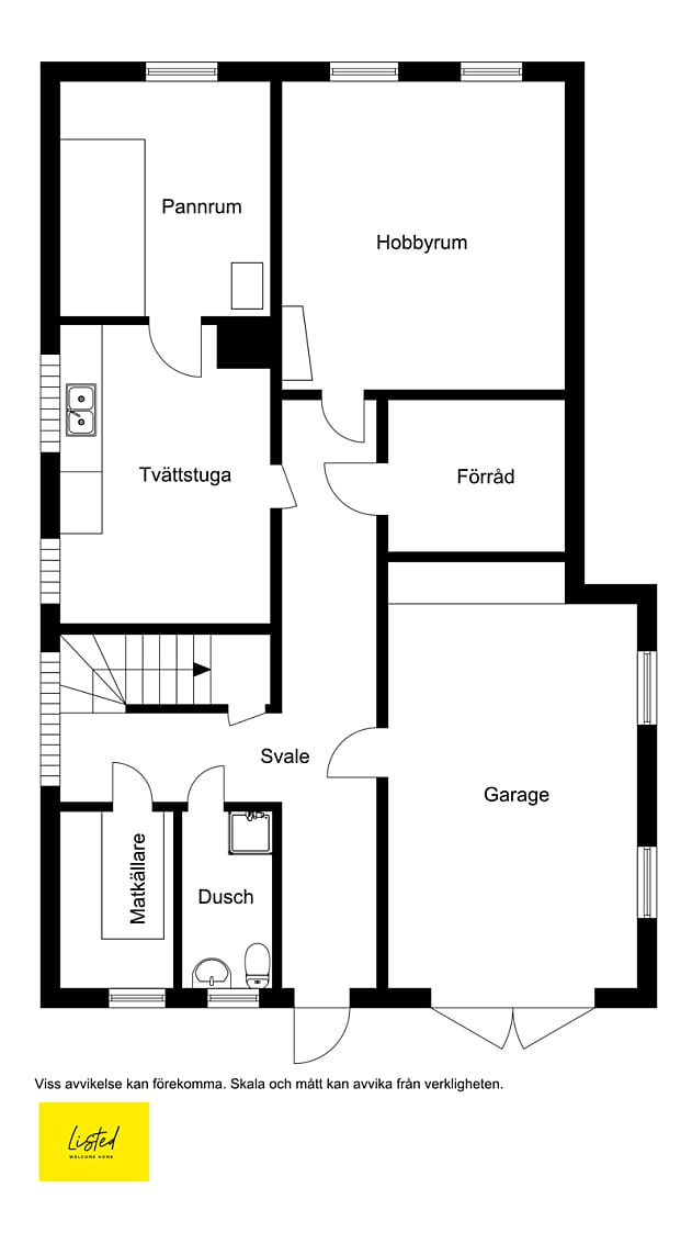 I källaren finner du en mysig gillestuga med eldstad, tvättstuga med tvättmaskin och torktumlare, förråd, matkällare, duschrum med toalett samt ett rymligt garage.