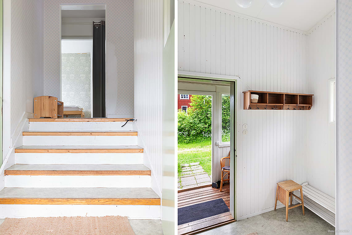 Välkomnande entré med plats för avhängning av ytterkläder och skor. Härifrån når du bostadens badrum samt vidare in till kök och sovrumsdel.