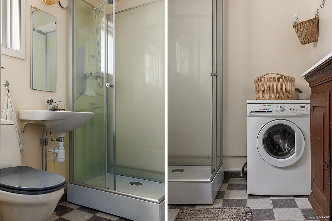Ligger i direkt anslutning till hallen. Ett praktiskt placerat rum med fönster för naturligt ljus och vädring. Här finns wc, handfat, dusch, spegel och tvättmaskin.